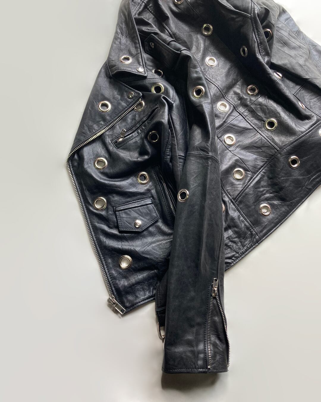 直径30mmのハトメをハンドカスタムでランダムに配したONE & ONLYのライダースジャケットです。