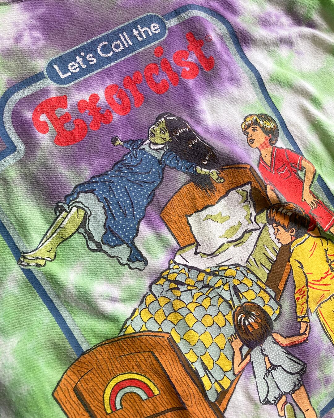 少女にに憑依した悪魔と神父の戦いを描いたオカルト映画の代表作、「エクソシスト」をコミカルにサンプリングしたタイダイTシャツです。
