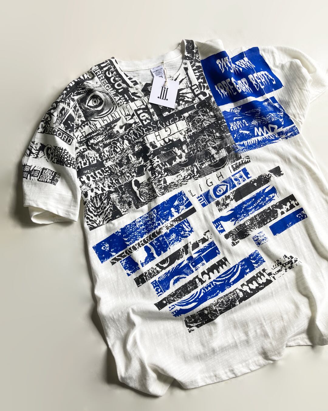 スラブ生地のボディに複数のシルクスクリーンを重ねた
