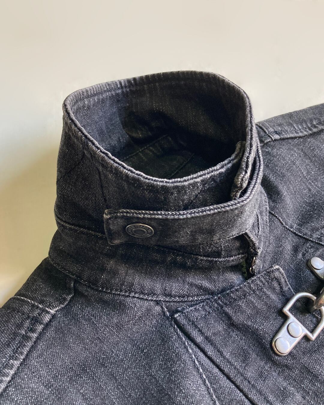 ブラックデニムに大きめのフック金具が武骨な印象です。