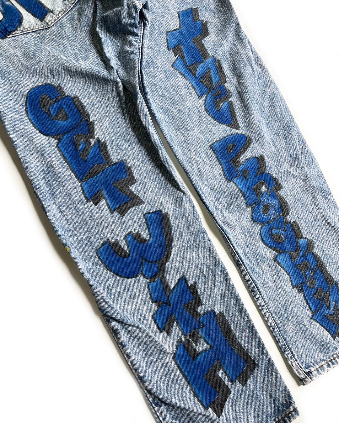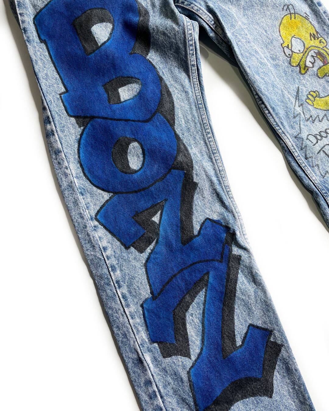 「 THE SIMPSONS 」のホーマー シンプソンとバート シンプソンがハンドペイントにて描かれた一点物のカスタムジーンズです。