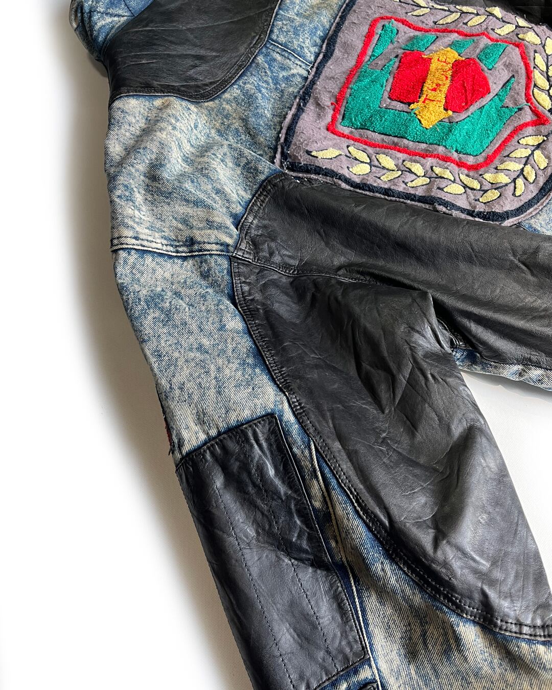 アシッドウォッシュ デニムにアシンメトリーデザインのレザー切り返しが入ったジャケットです。