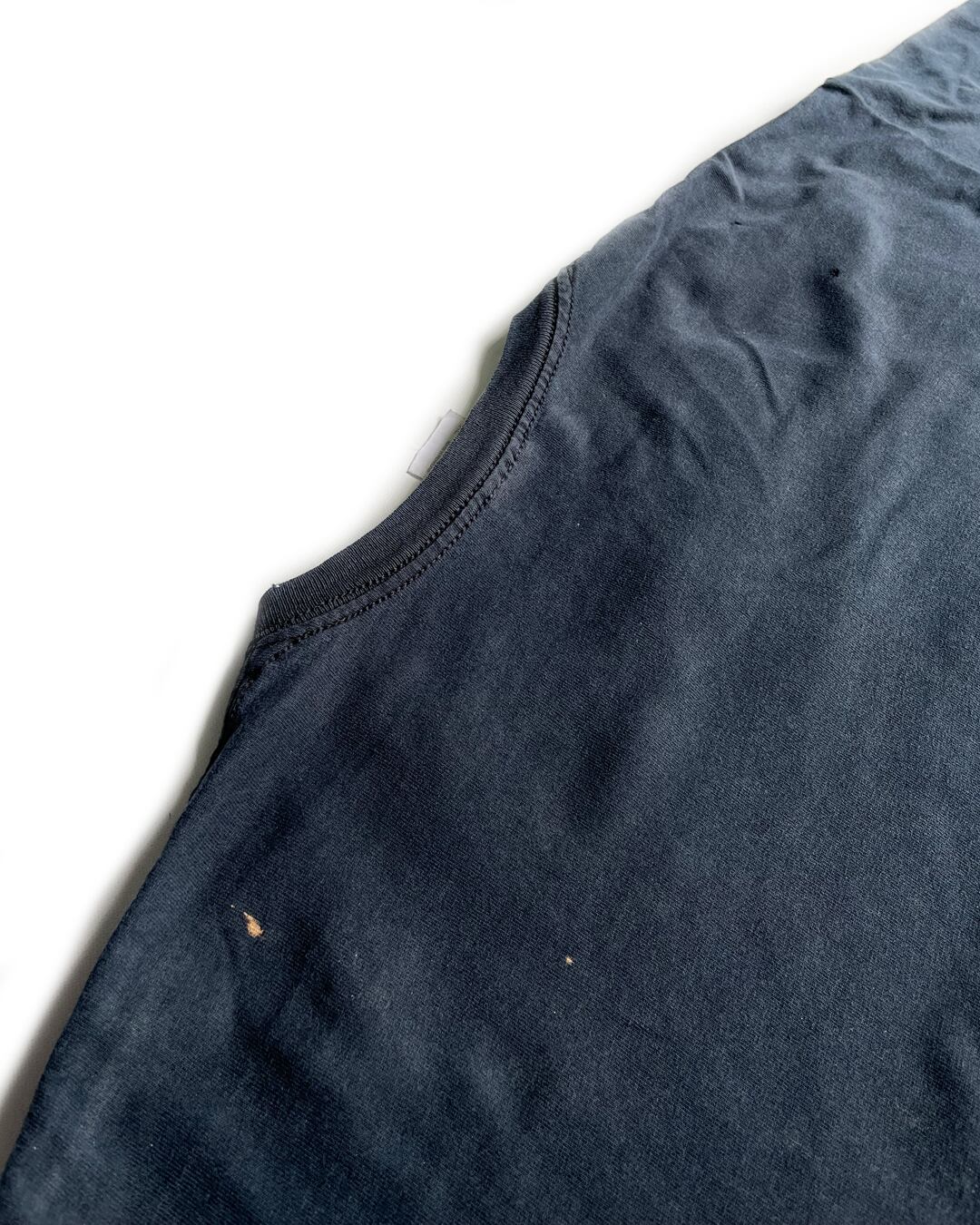 フロントネックリブ下方、バックの左肩付近にブリーチ飛びによる色抜けがございます。