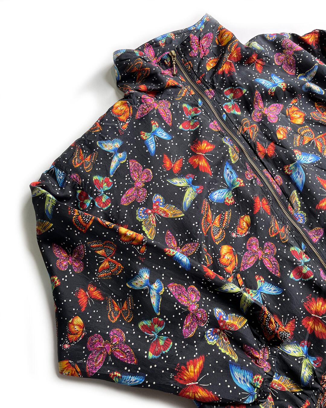 カラフルなバタフライ総柄のハイネック ジップアップ ジャケットです。